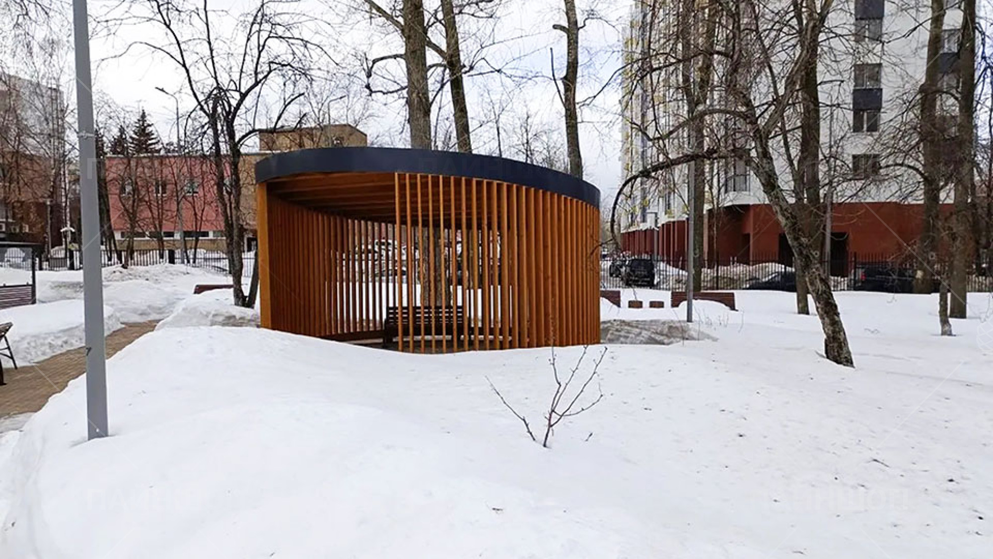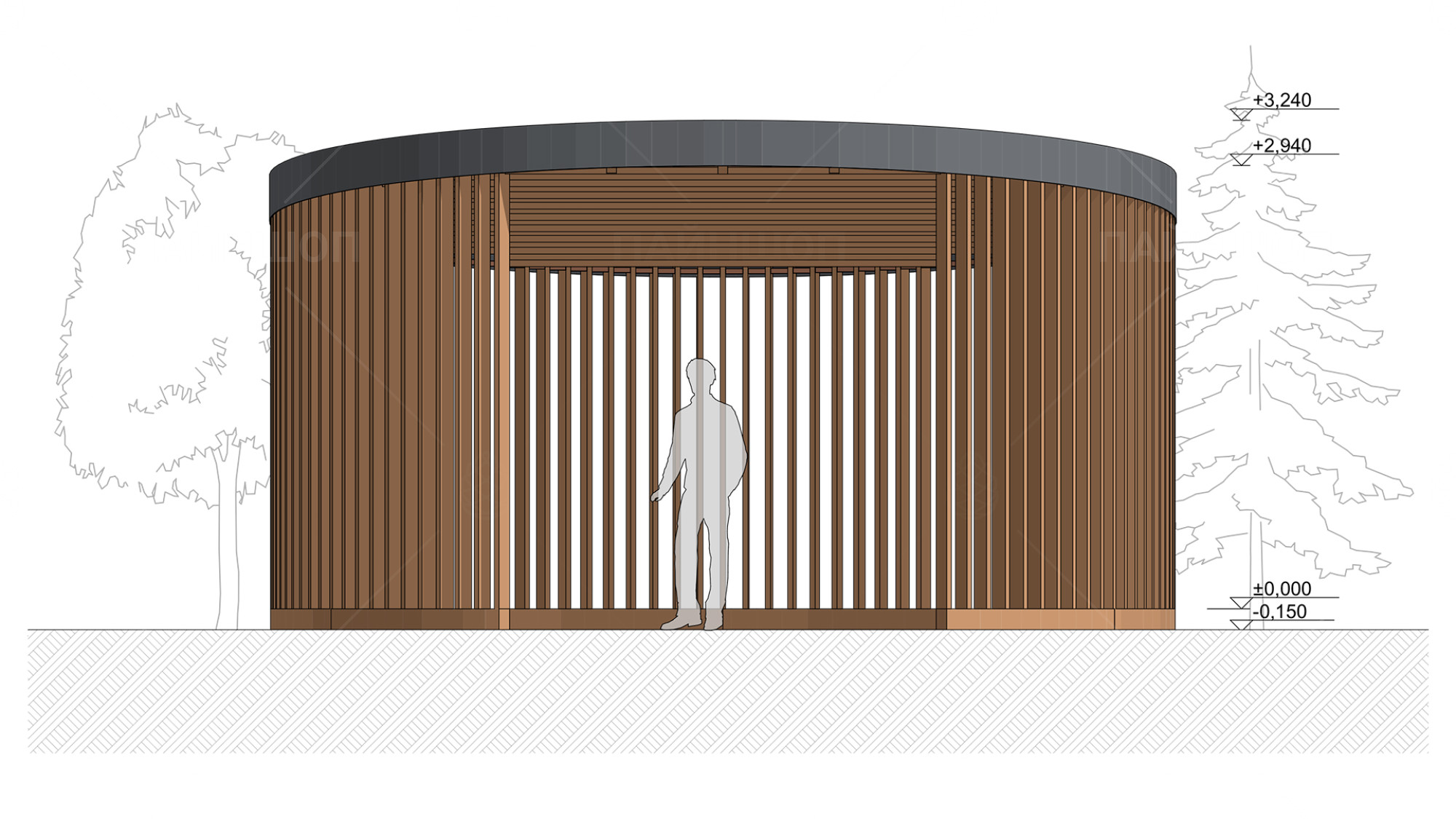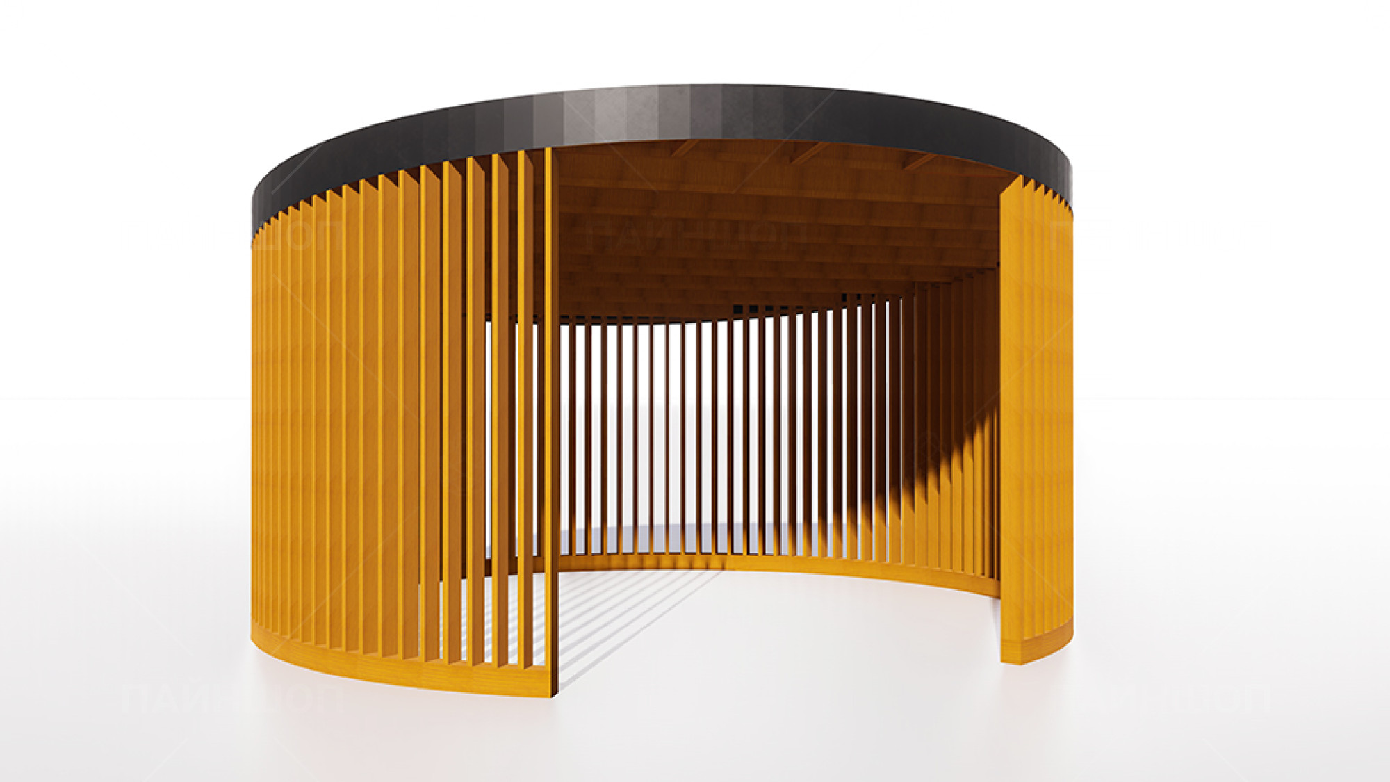Круглая беседка-сцена d=6м предназначена для размещения в прогулочно-парковой зоне как теневая зона отдыха . Стены конструкции выполнены из равномерно распределенных по окружности вертикальных стоек с подрезкой под угол наклона кровли. Мощная стропильная из двутавровых балок, опирающихся на конструкцию стен. Законченность внешнего вида конструкции придает широкая металлическая планка в уровень конструкции кровли. Сцена устанавливается на бетонное основание.