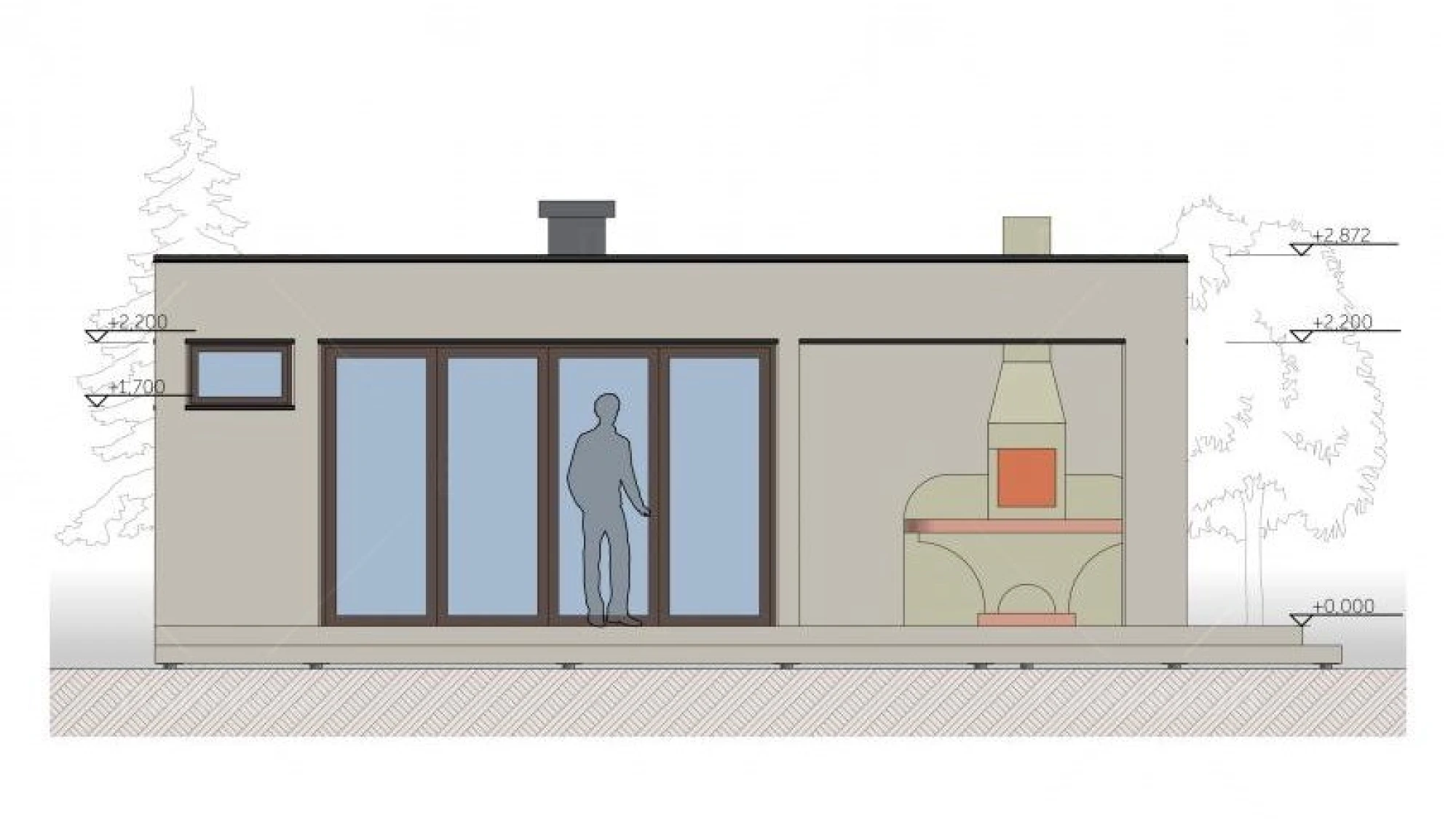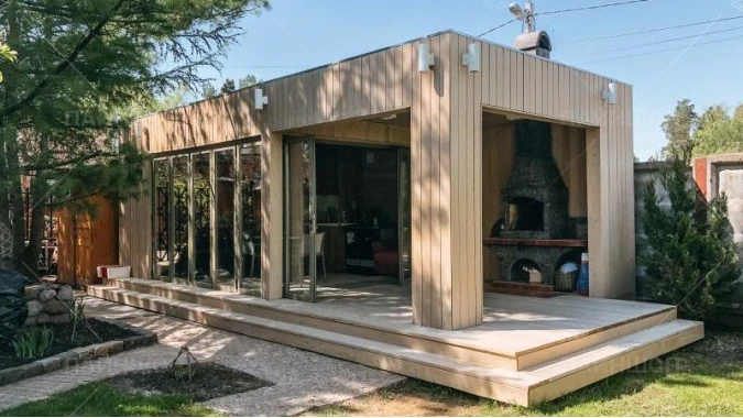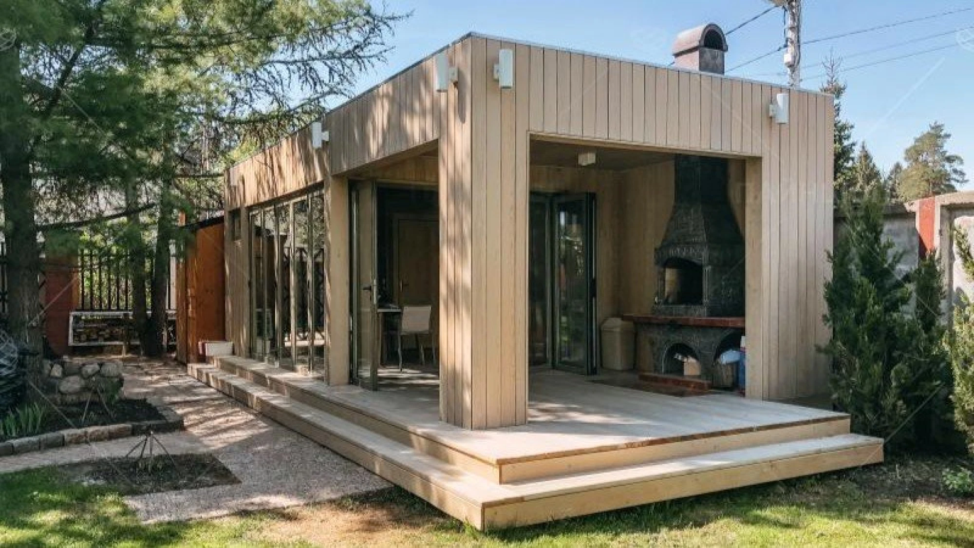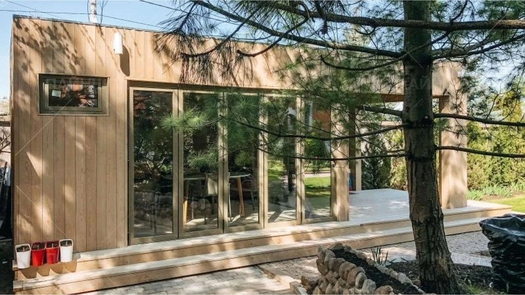 Конструкция дома объединяет закрытую зону и просторную открытую террасу. Общая площадь около 20 м² позволяет организовать функциональное помещение с кухней, зоной отдыха и местом для сна. Благодаря панорамным раздвижным окнам помещение наполняется естественным светом, а изнутри открывается вид на сад или участок.