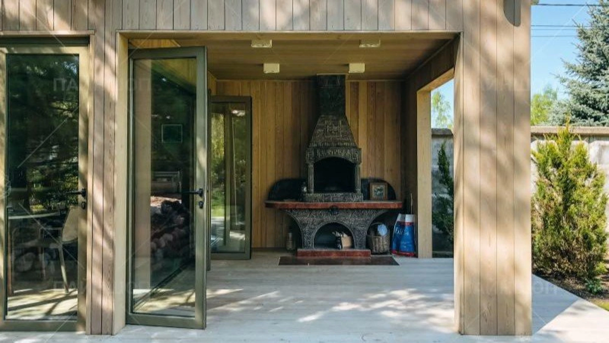 Широкая терраса с деревянным настилом становится естественным продолжением дома — здесь удобно обедать, устраивать вечерние посиделки или просто наслаждаться свежим воздухом. При этом крыша и лёгкий навес над входом защищают от осадков и прямых солнечных лучей, сохраняя комфорт даже в жаркие дни.