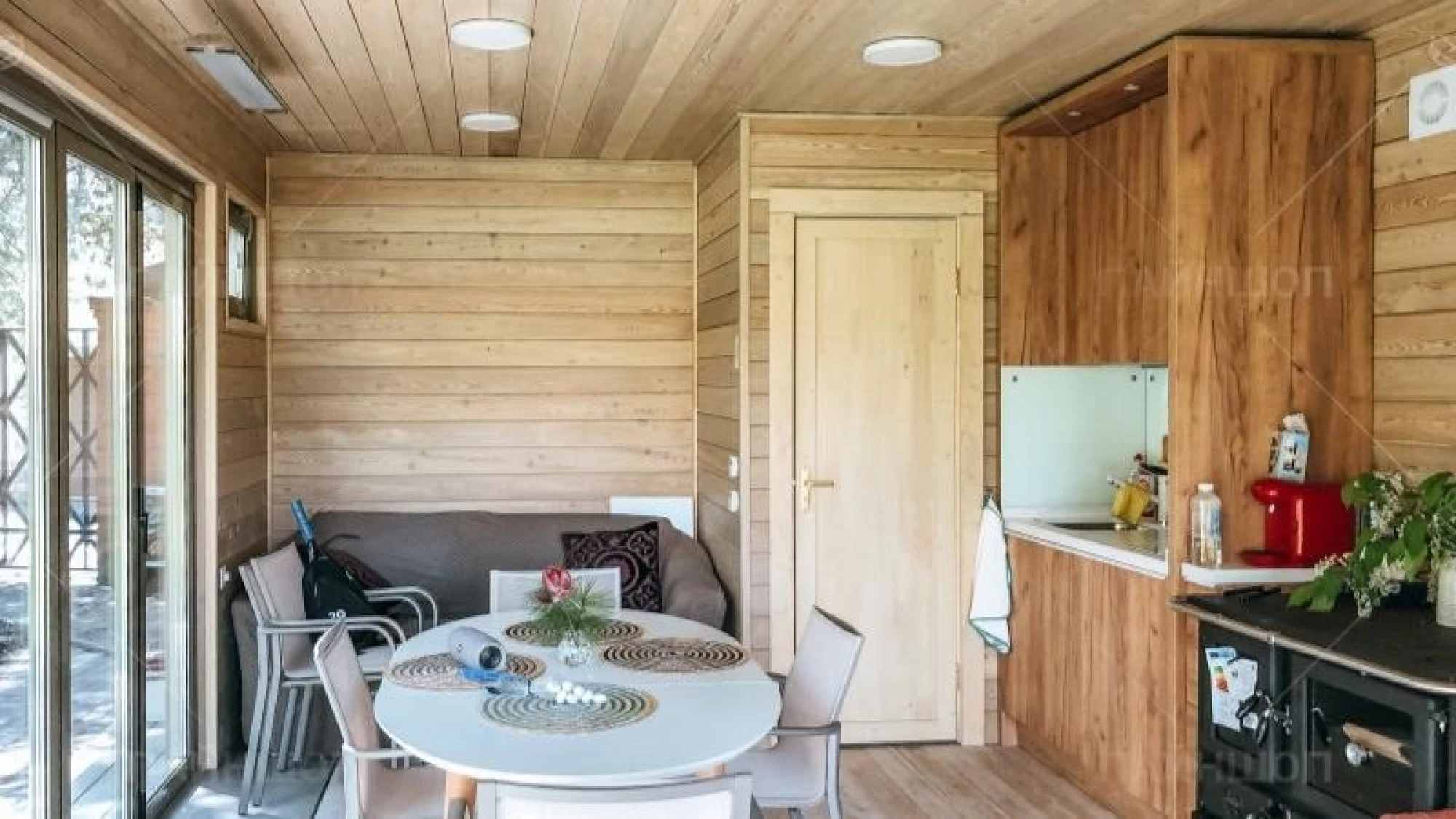 Интерьер легко адаптируется под любые потребности — от уютной дачной кухни до мини-гостиной с диваном и камином. Большие окна визуально расширяют пространство, а продуманное освещение делает атмосферу особенно тёплой в вечерние часы.