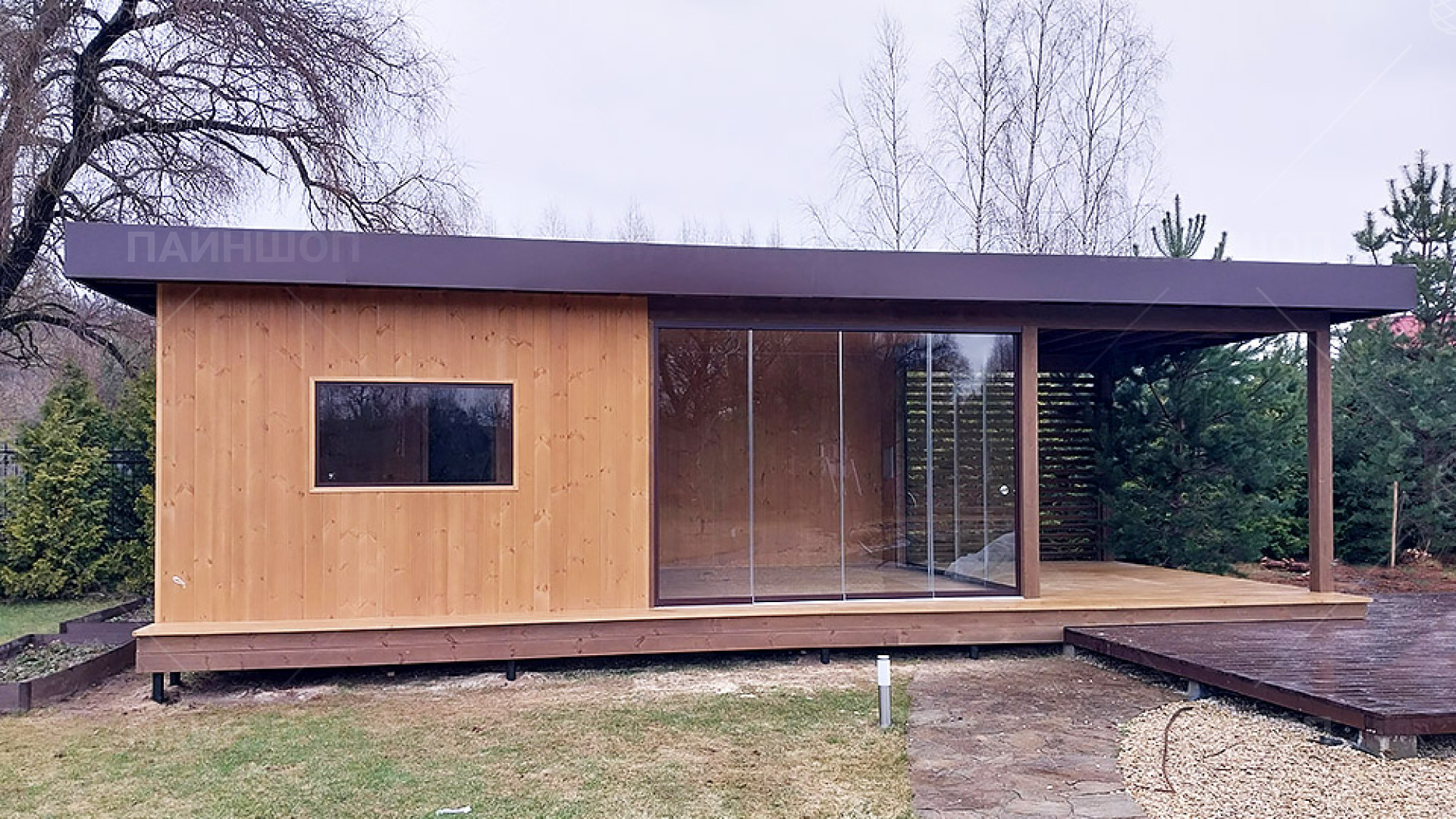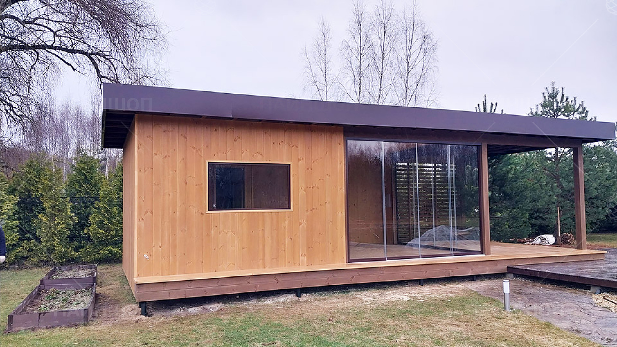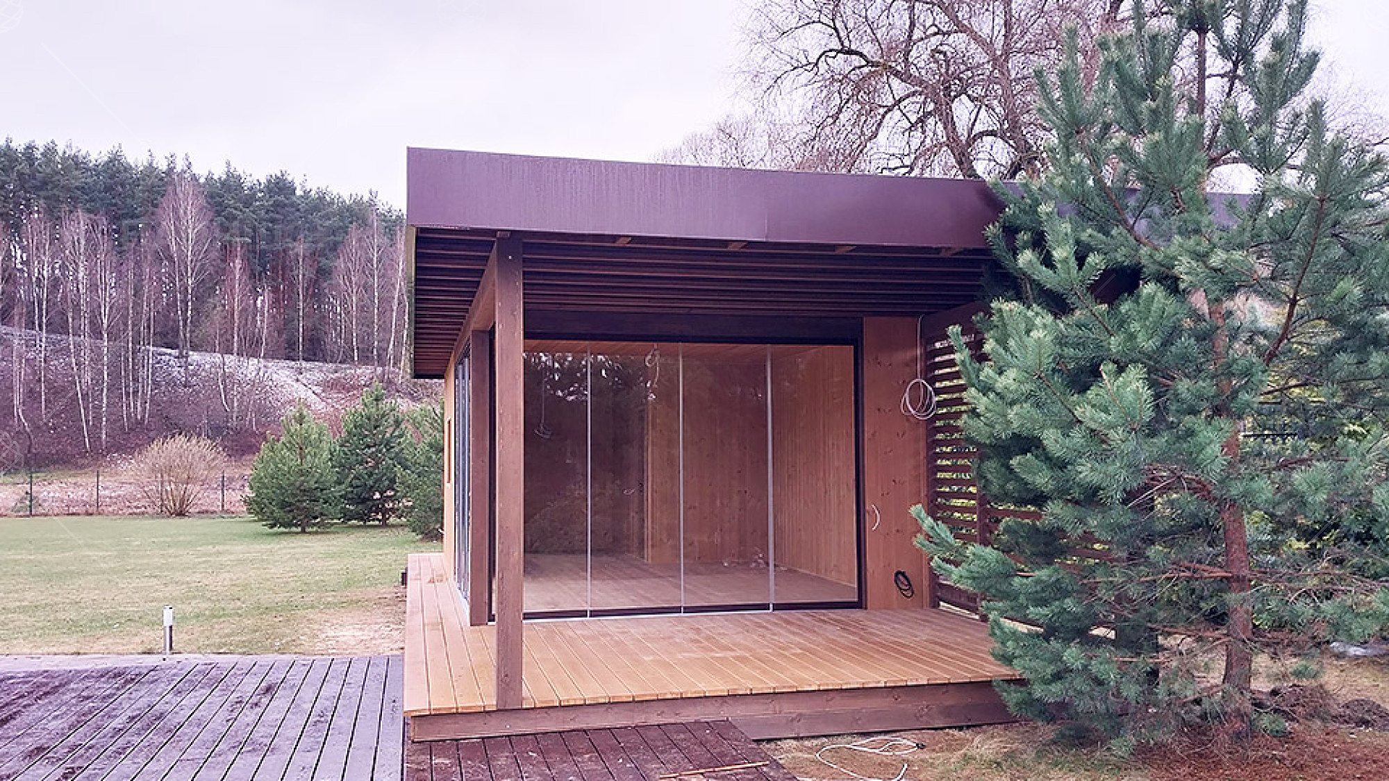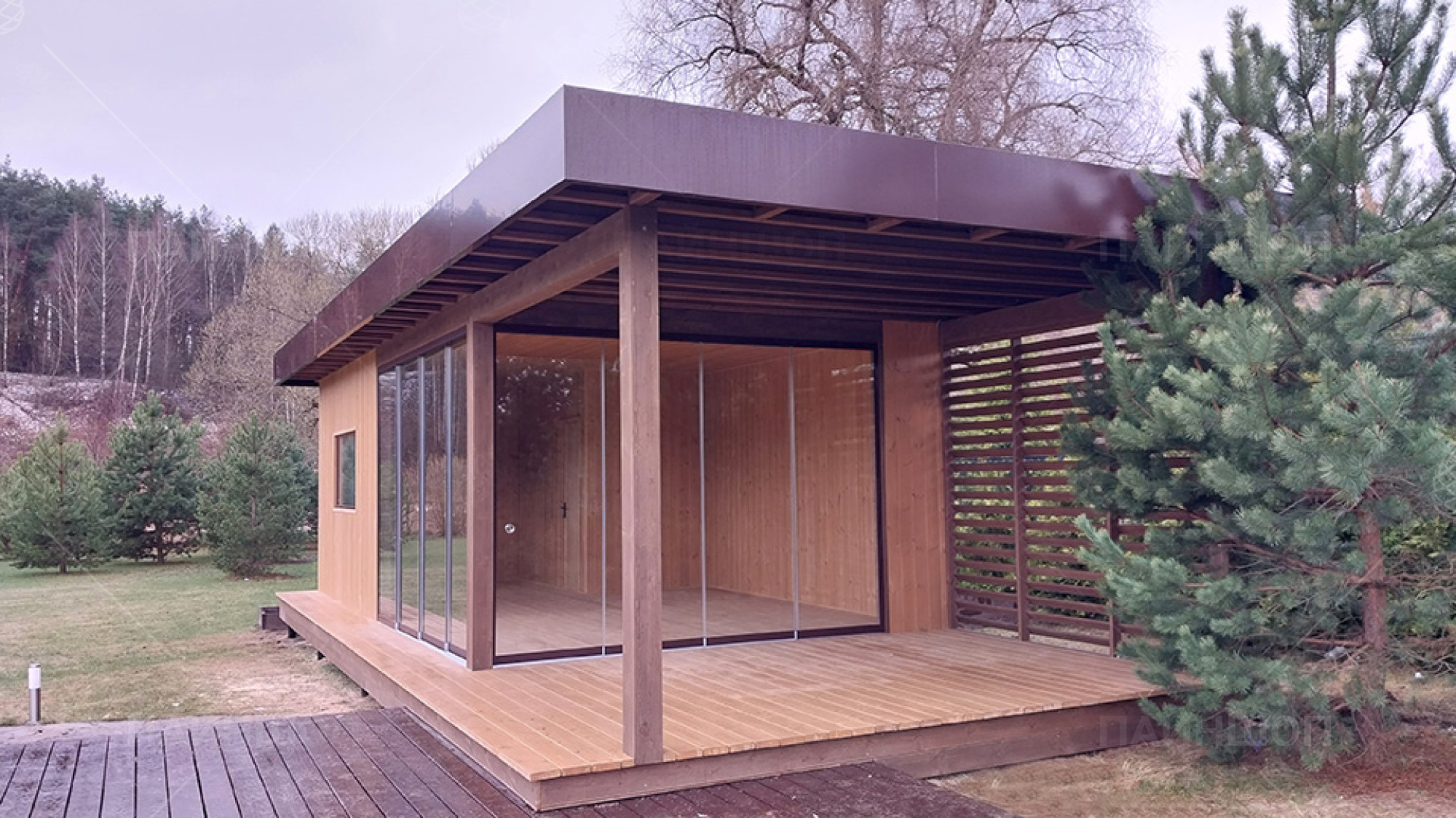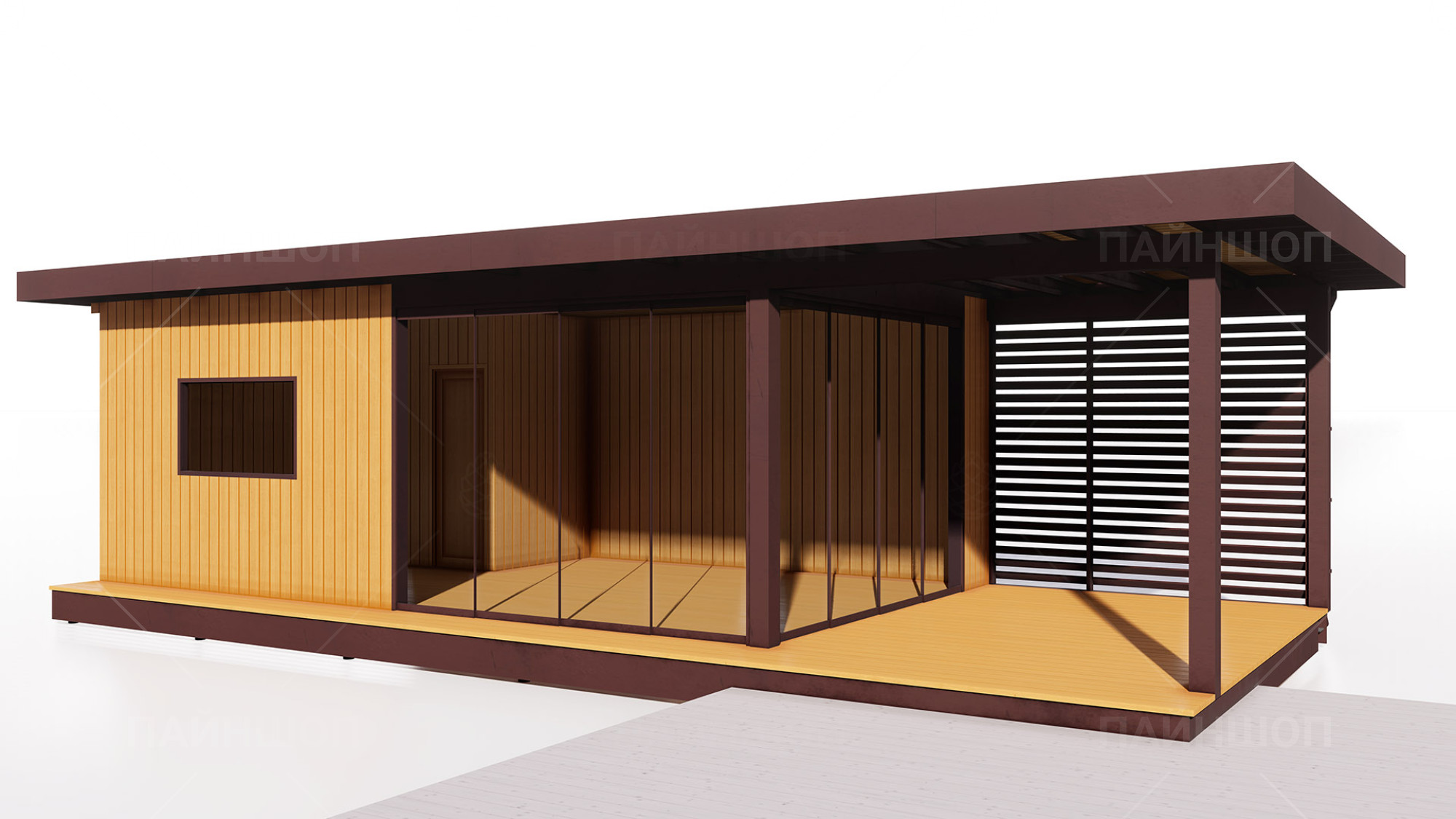 Дом оснащен холодным безрамным панорамным остеклением высотой 2,5 м , подходит для круглогодичного использования. Дополнительное глухое обзорное окно с алюминиевым профилем расположено в кухонной зоне и будет хорошим освещением над столом или барной стойкой. Зона барбекю ограждена по задней стене стильными жалюзийными решетками, что обеспечивает закрытость пространства от посторонних глаз и позволяет разместить конструкцию вдоль забора. Санузел оснащен перегородкой для отделения душевой кабины, вход обеспечивается деревянной глухой дверью. Помещение гостиной предполагает зонирование в формате студии с расположением кухонной зоны и зоны отдыха.