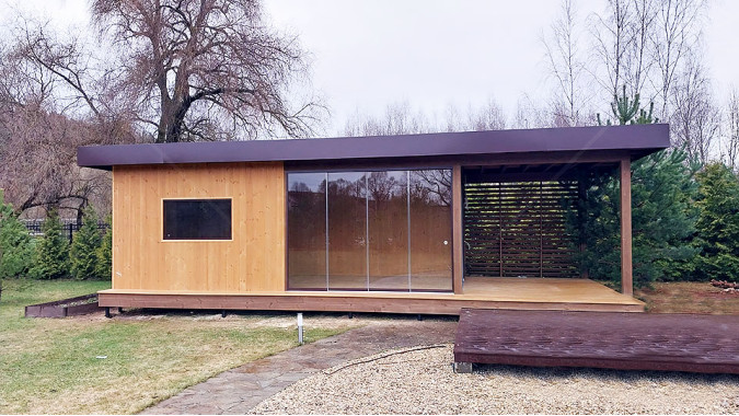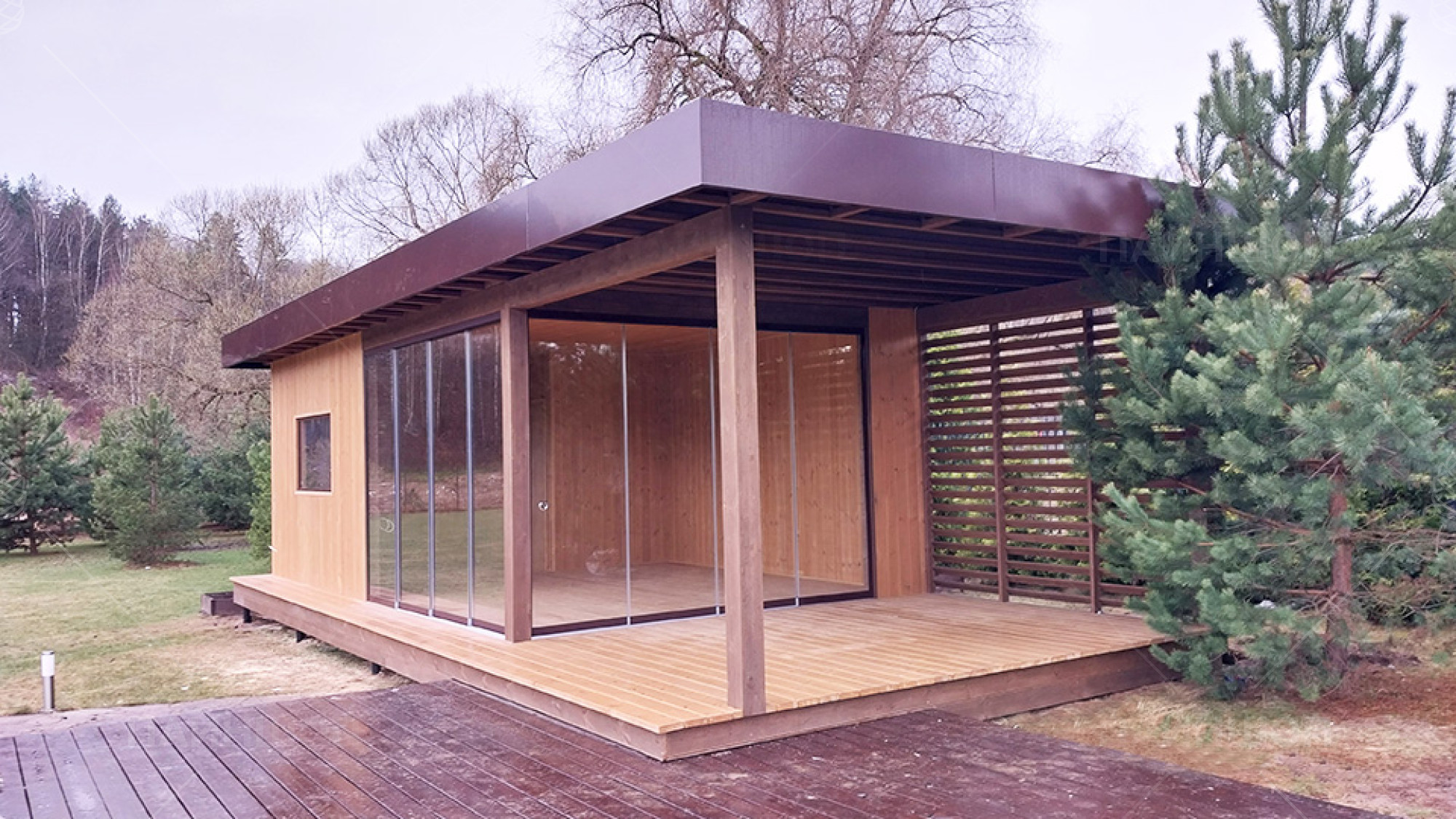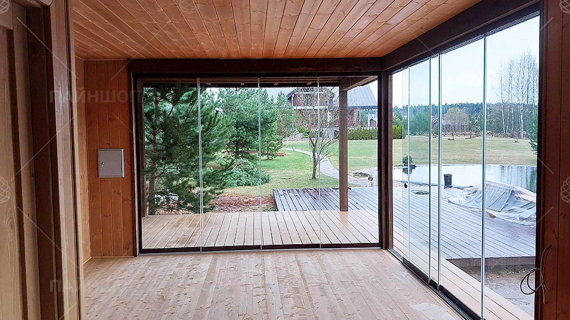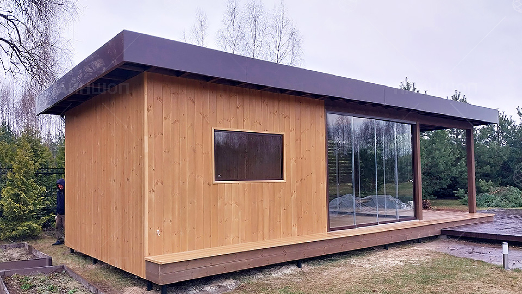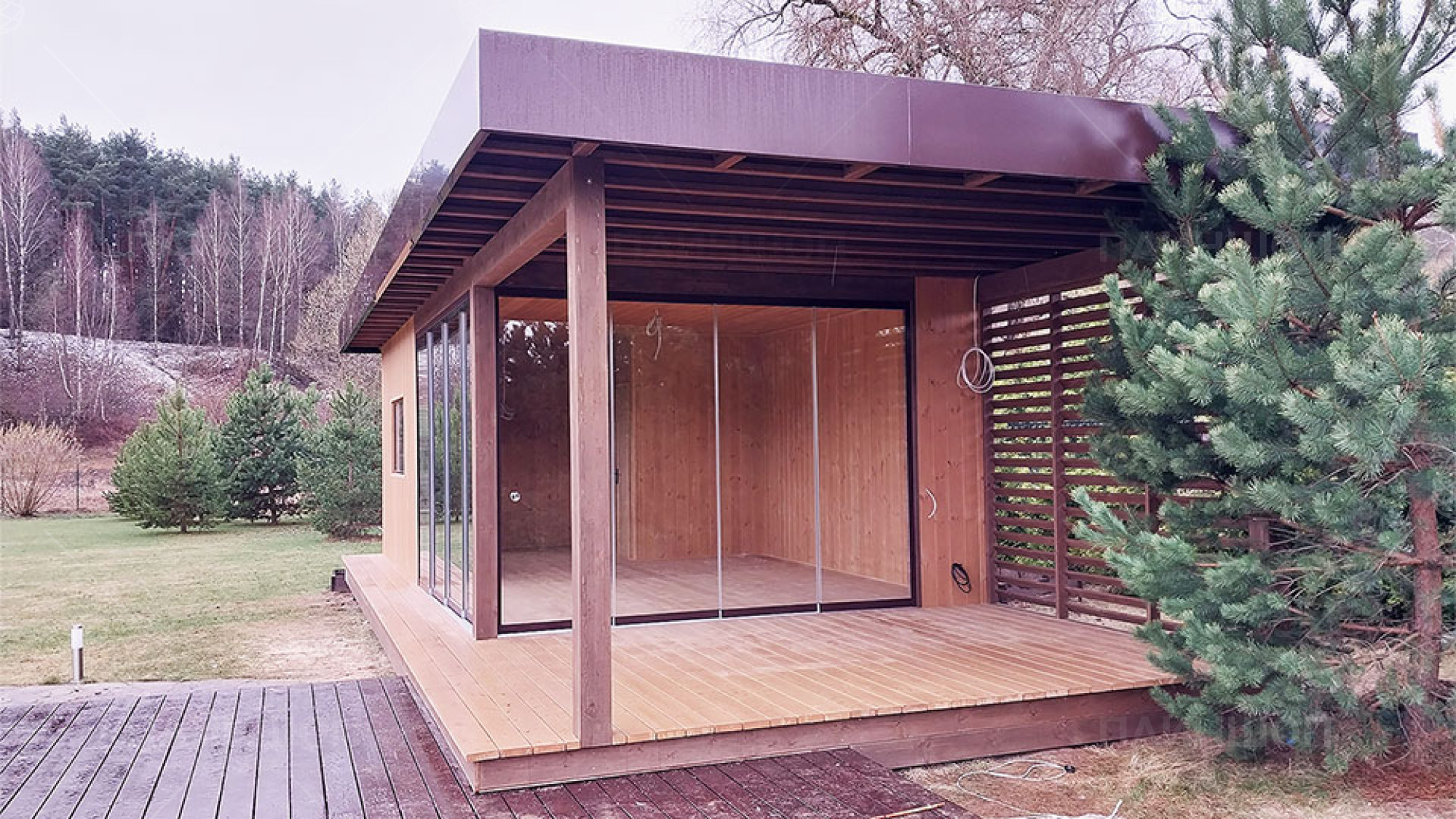 Дом оснащен холодным безрамным панорамным остеклением высотой 2,5 м , подходит для круглогодичного использования. Дополнительное глухое обзорное окно с алюминиевым профилем расположено в кухонной зоне и будет хорошим освещением над столом или барной стойкой. Зона барбекю ограждена по задней стене стильными жалюзийными решетками, что обеспечивает закрытость пространства от посторонних глаз и позволяет разместить конструкцию вдоль забора. Санузел оснащен перегородкой для отделения душевой кабины, вход обеспечивается деревянной глухой дверью. Помещение гостиной предполагает зонирование в формате студии с расположением кухонной зоны и зоны отдыха.
