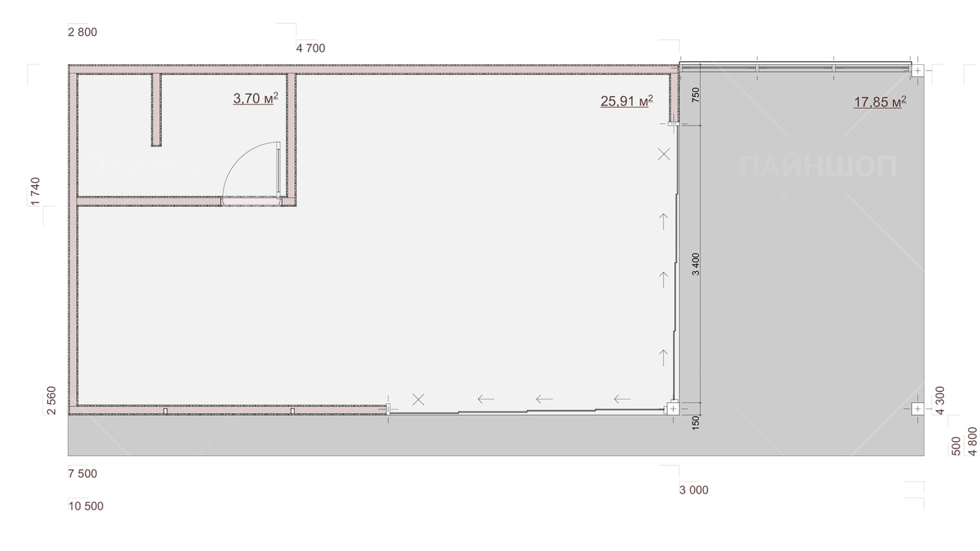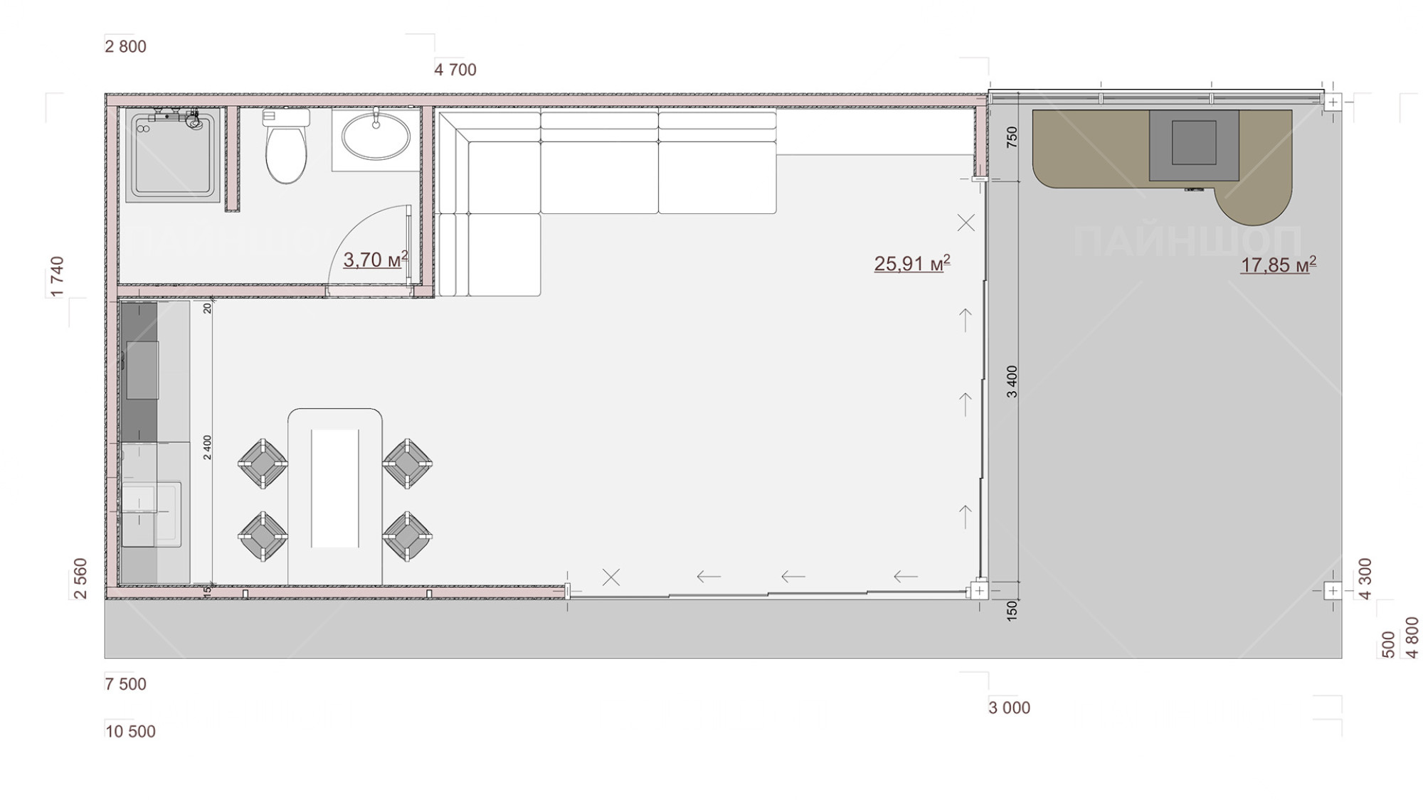 Каркасный гостевой летний дом Денвер в размере 4,8х10,5 м с зоной барбекю 3х4,8 м, угловой гостиной 7,5х4,3 м и санузлом 2,8х1,74 м.