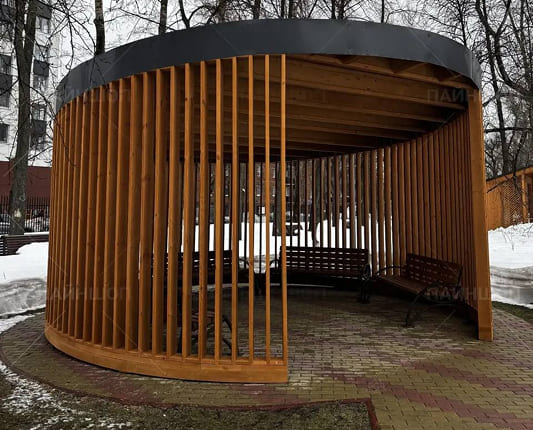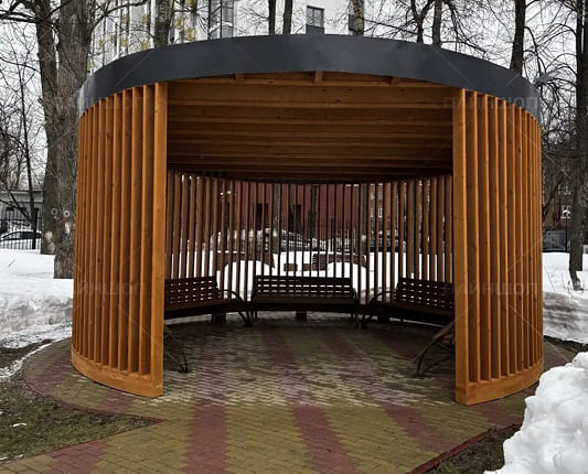 Круглая беседка была выбрана представителем заказчика в парковой зоне, где были уже предусмотрены ландшафтные дорожки и круглое по форме место под постройку. Круглый цилиндр, с покатой крышей. Простая понятная форма - без декора, без фундамента, без водостока. Простая утилитарная форма, которая не несет дополнительной художественной, или функциональной, или технической нагрузки. Для общественного пространства не нужно лишнего - эта беседка для всех.