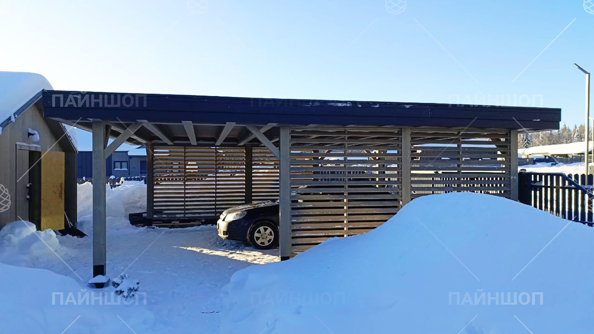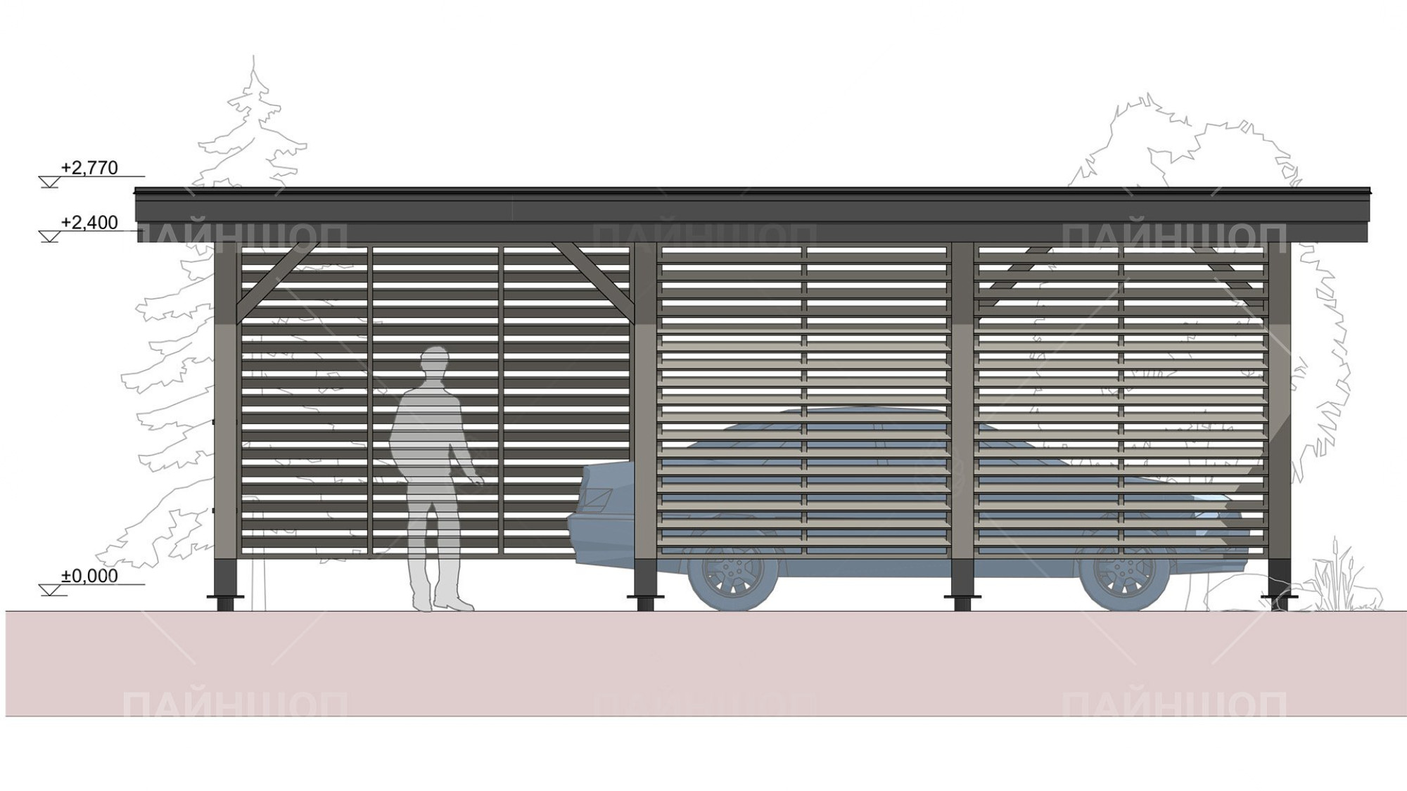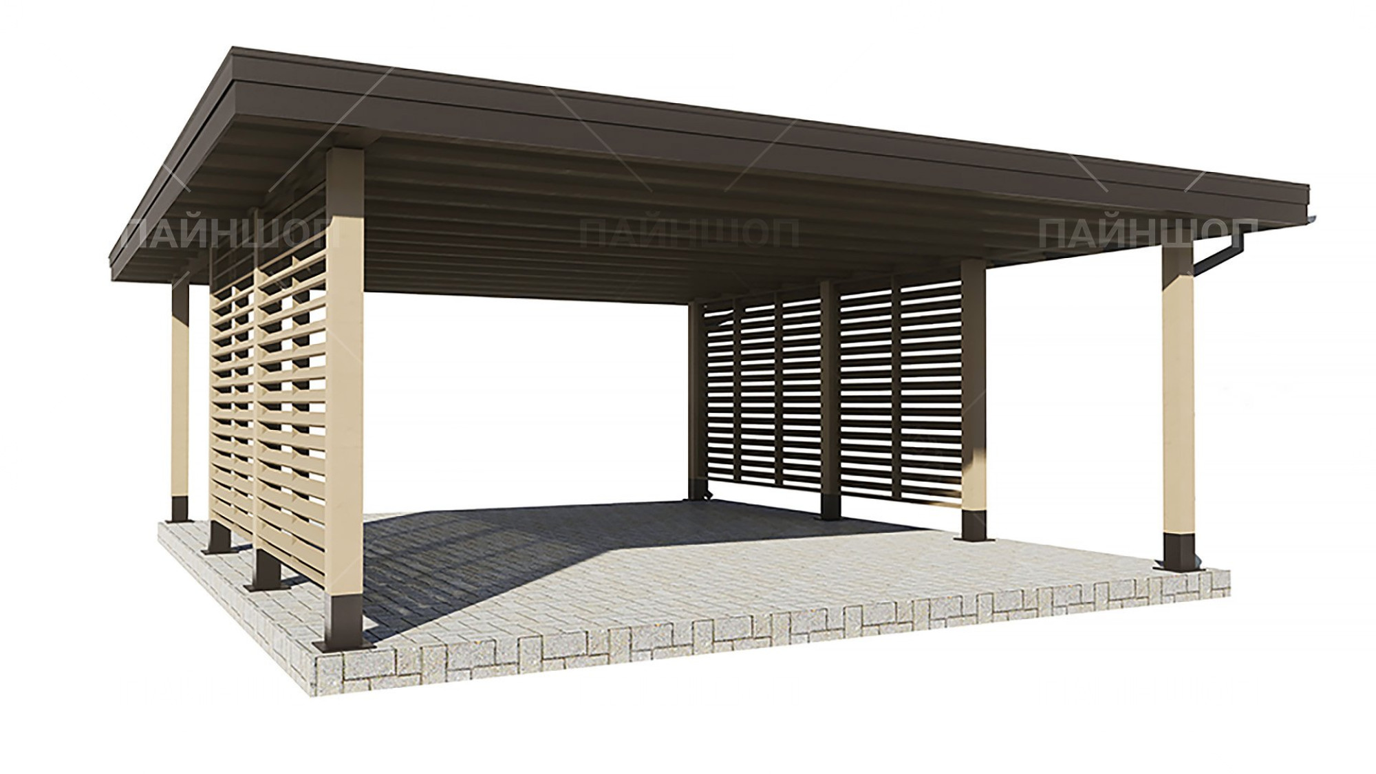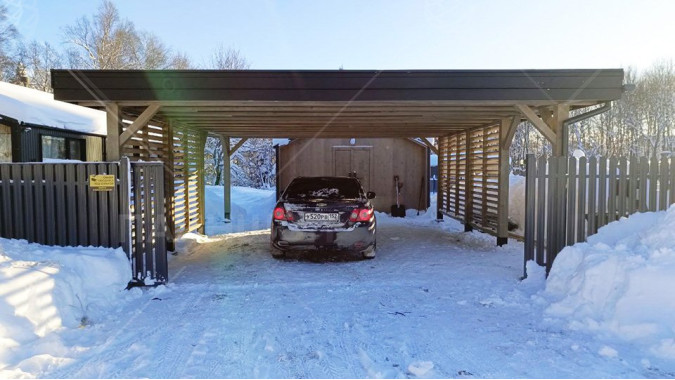Проанализировав множество различных проектов навесов для авто, мы пришли к лаконичному и стильному решению, результатом которого стала серия автонавесов "Гамбург". Габариты навеса выбраны не случайно: часто наличие одного парковочного места бывает недостаточно для загородного участка, поэтому здесь есть место для двух машин. В то же время общий габарит навеса - 6,25х7,3 м делает навес просторным и позволяет разместить под ним не только авто. По двум сторонам имеется деревянное жалюзийное ограждение с ассиметрично расположенными проходами, что защитит от прямых лучей солнца и косого дождя, а так же создаст зонирование вашего участка. В данной модели отсутствует хозблок, что позволяет сэкономить на итоговой цене.