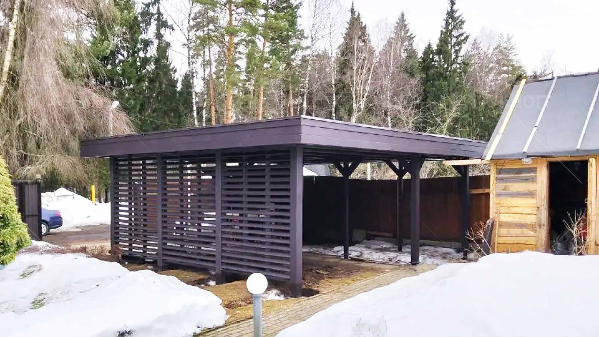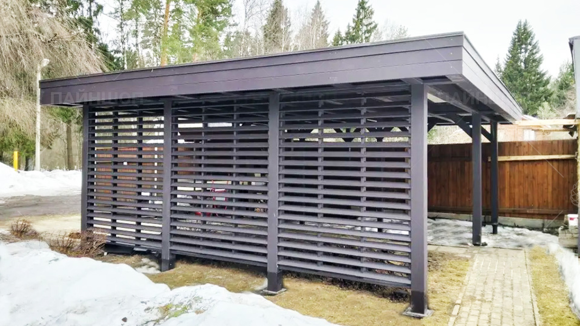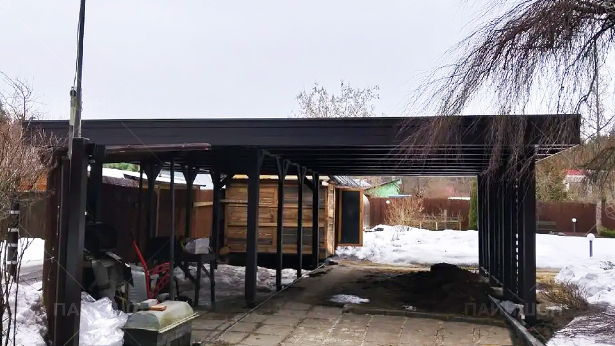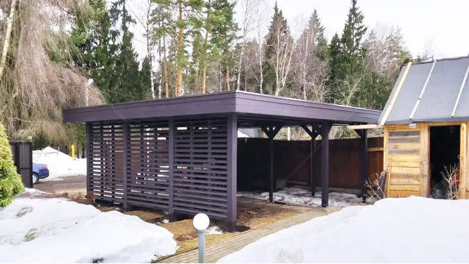 Такой навес станет стильным и многофункциональным дополнением вашему земельному участку и обеспечит хранение авто и инвентаря.