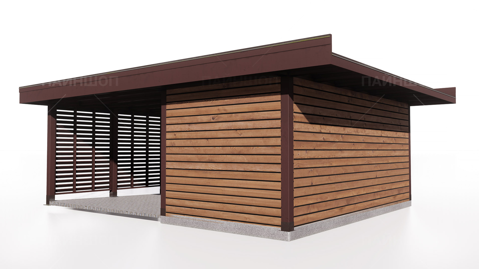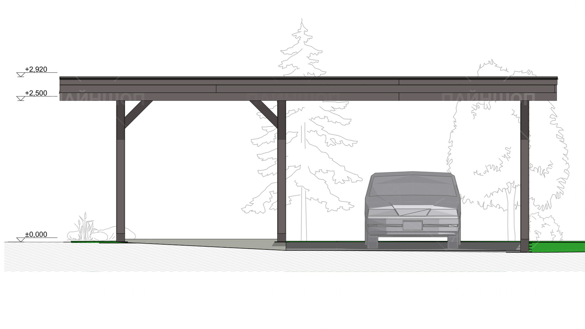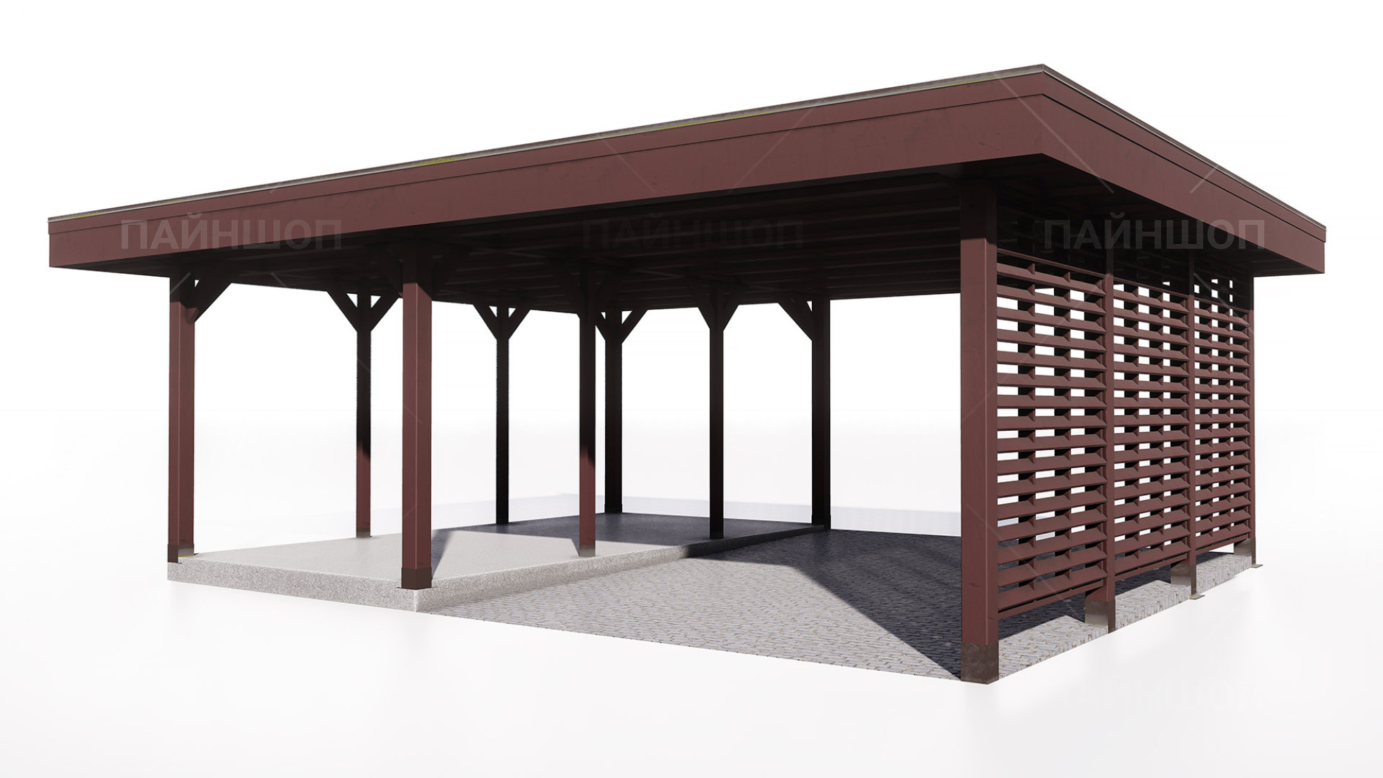Такой навес станет стильным и многофункциональным дополнением вашему земельному участку и обеспечит хранение авто и инвентаря.