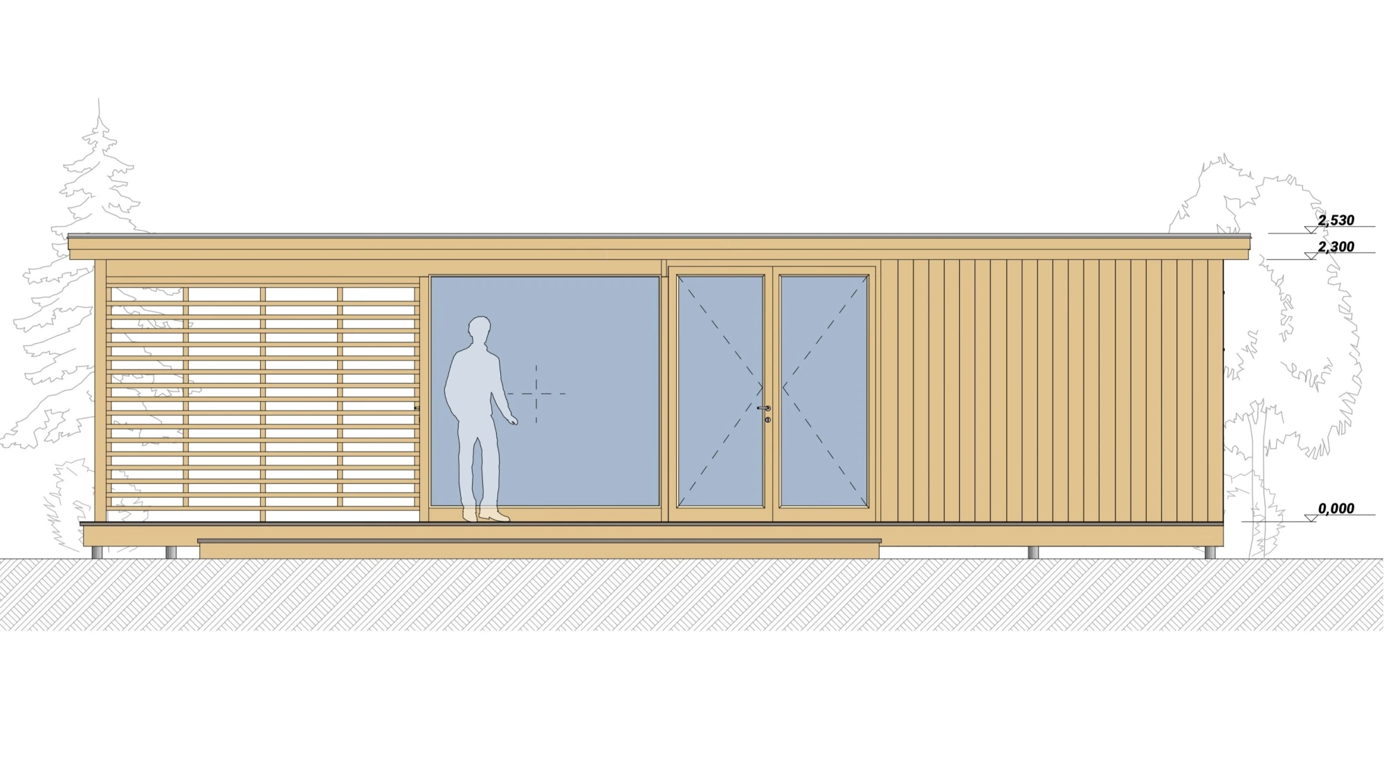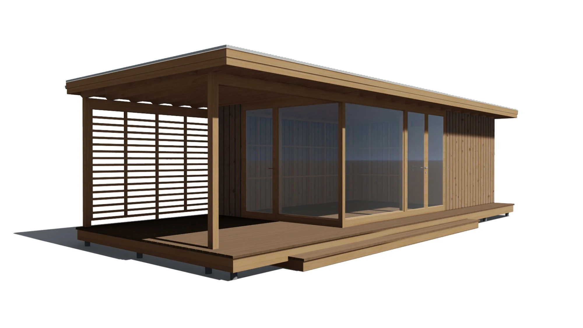 Открытая терраса — это идеальное место для организации зоны отдыха или барбекю. По задней стороне открытой части предусмотрено декоративное ограждение в виде жалюзийной решётки, которое добавляет приватности, защищает от ветра и придаёт павильону стильный, современный акцент.