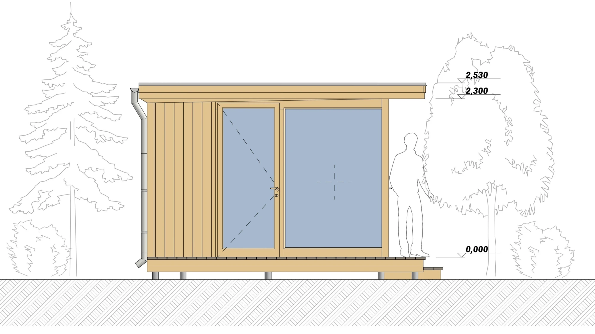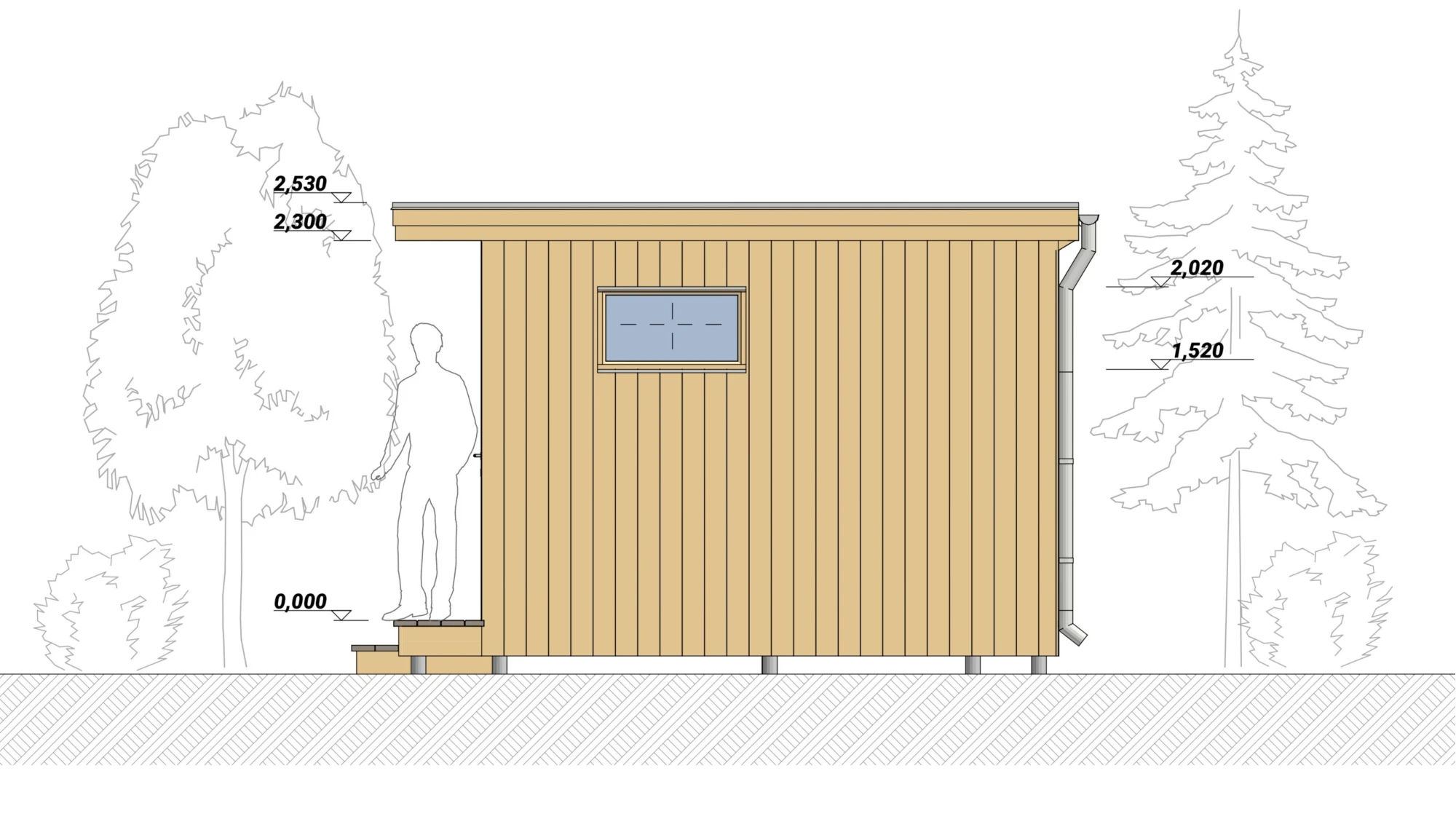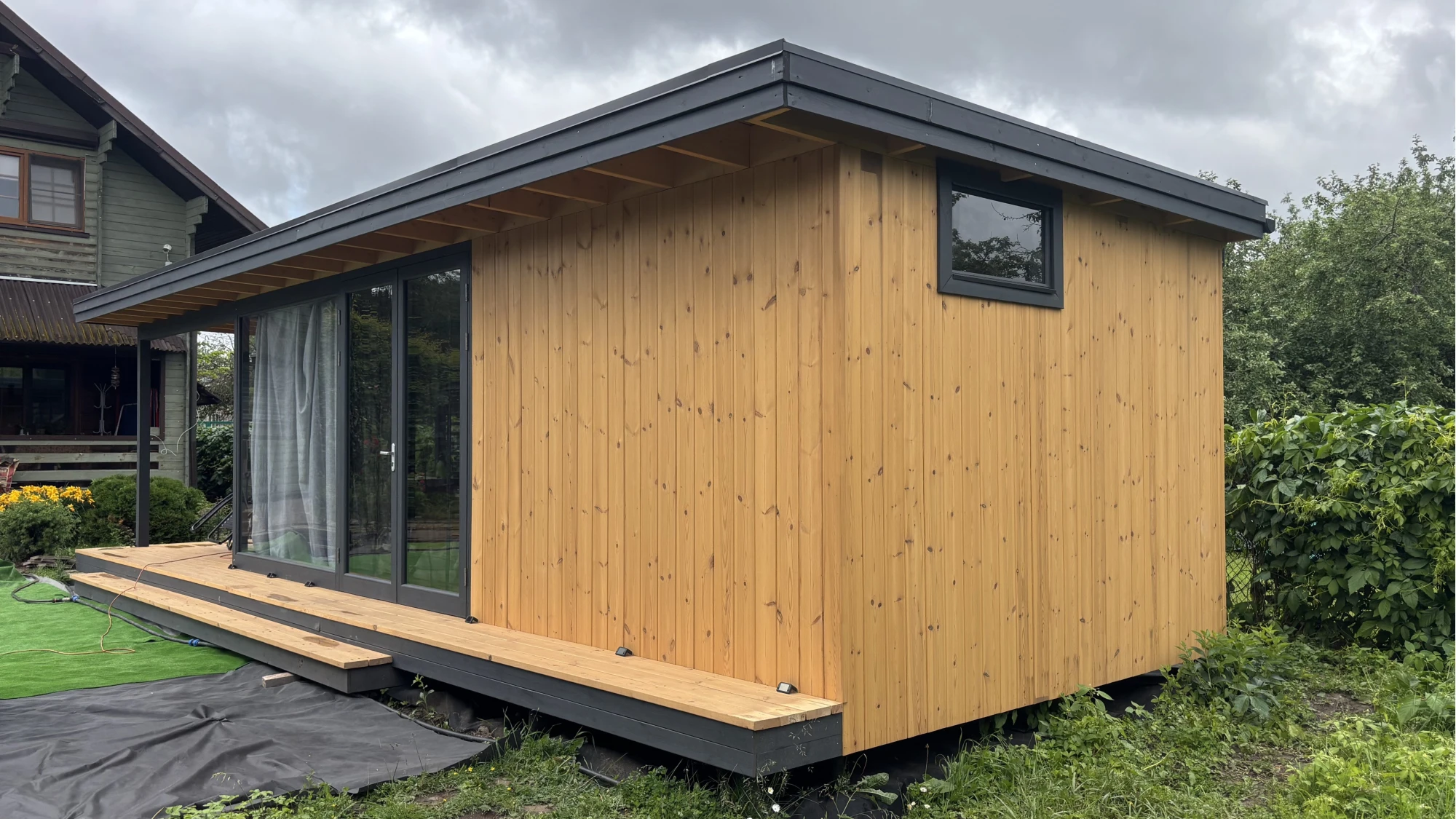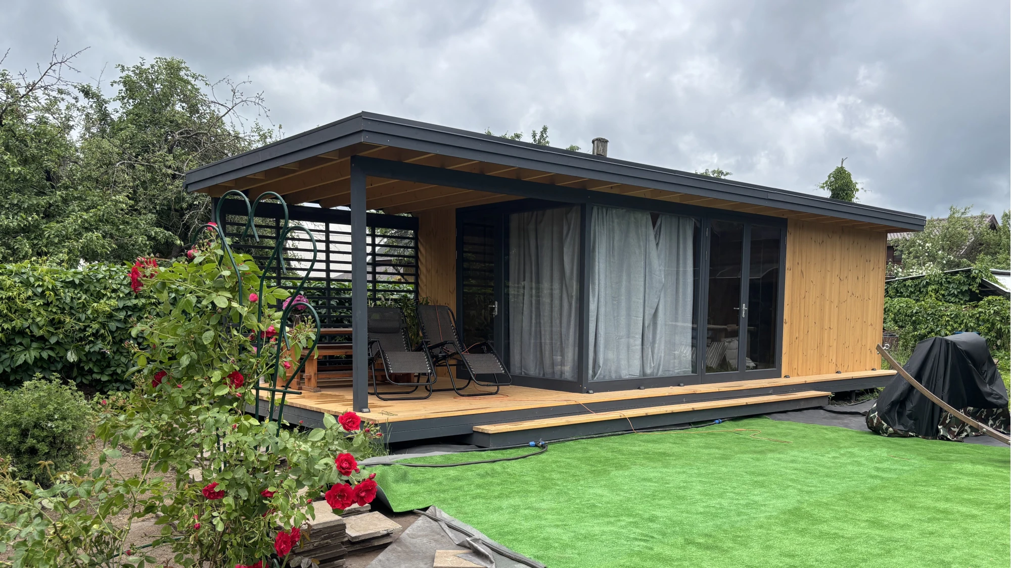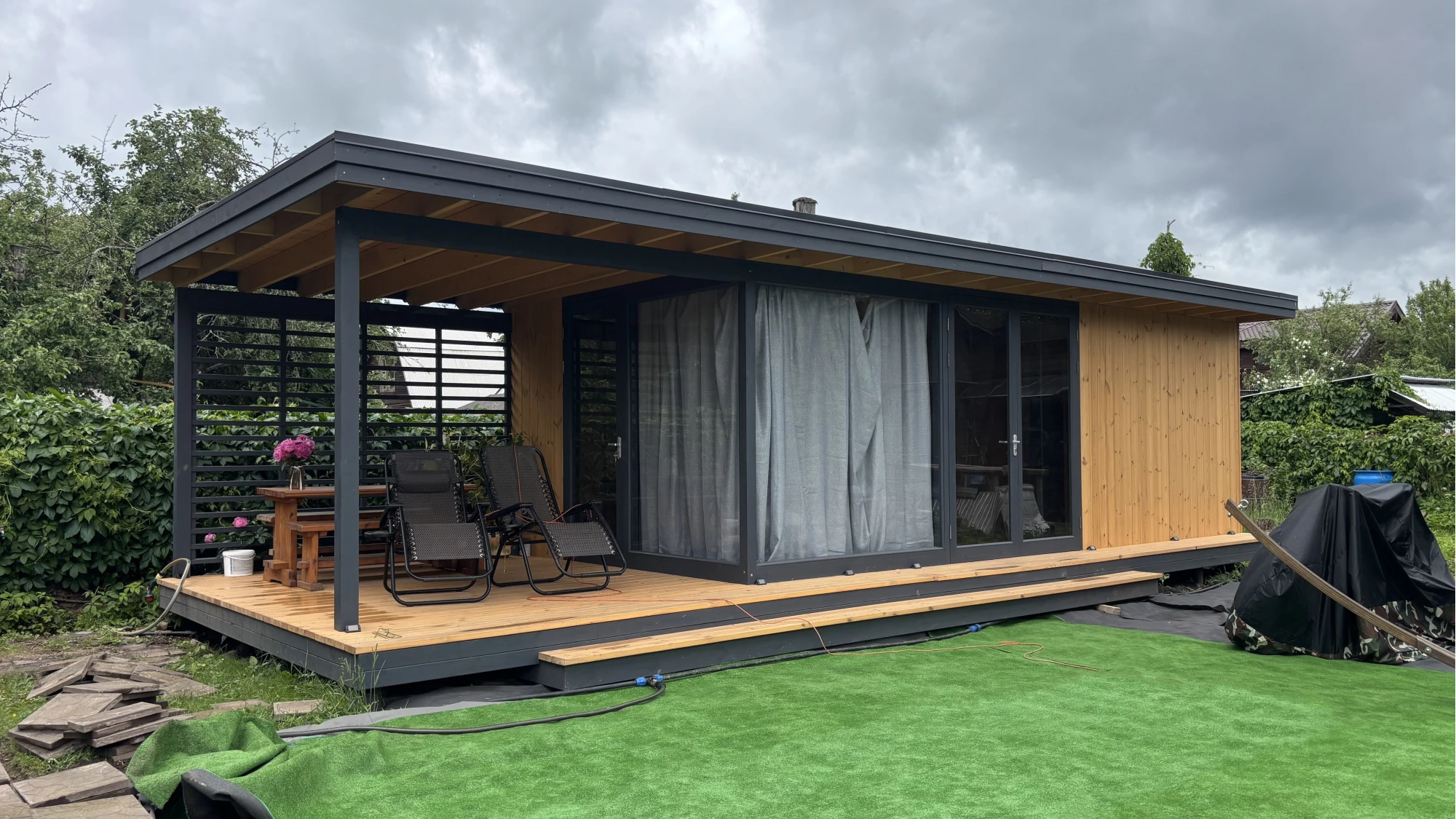 Особенностью павильона является гармоничное сочетание закрытой и открытой частей. Закрытая зона с панорамным остеклением размером 7,1х3,5 м позволяет наслаждаться природой в любое время года, сохраняя тепло и уют внутри. Внутри предусмотрено дополнительное помещение размером 1,7х3,5 м с небольшим окном — его можно использовать как кладовую, зону хранения или компактный рабочий кабинет.