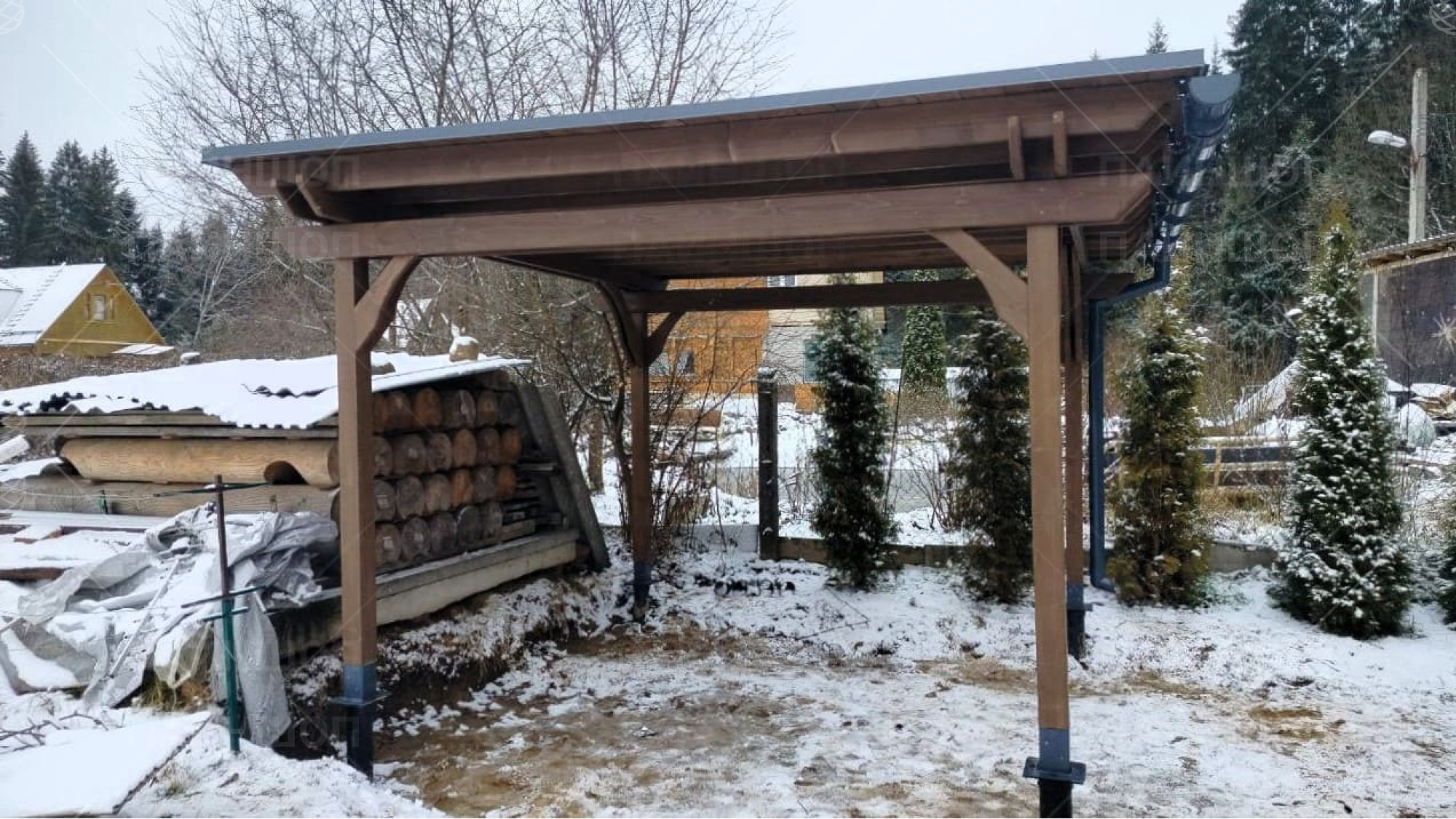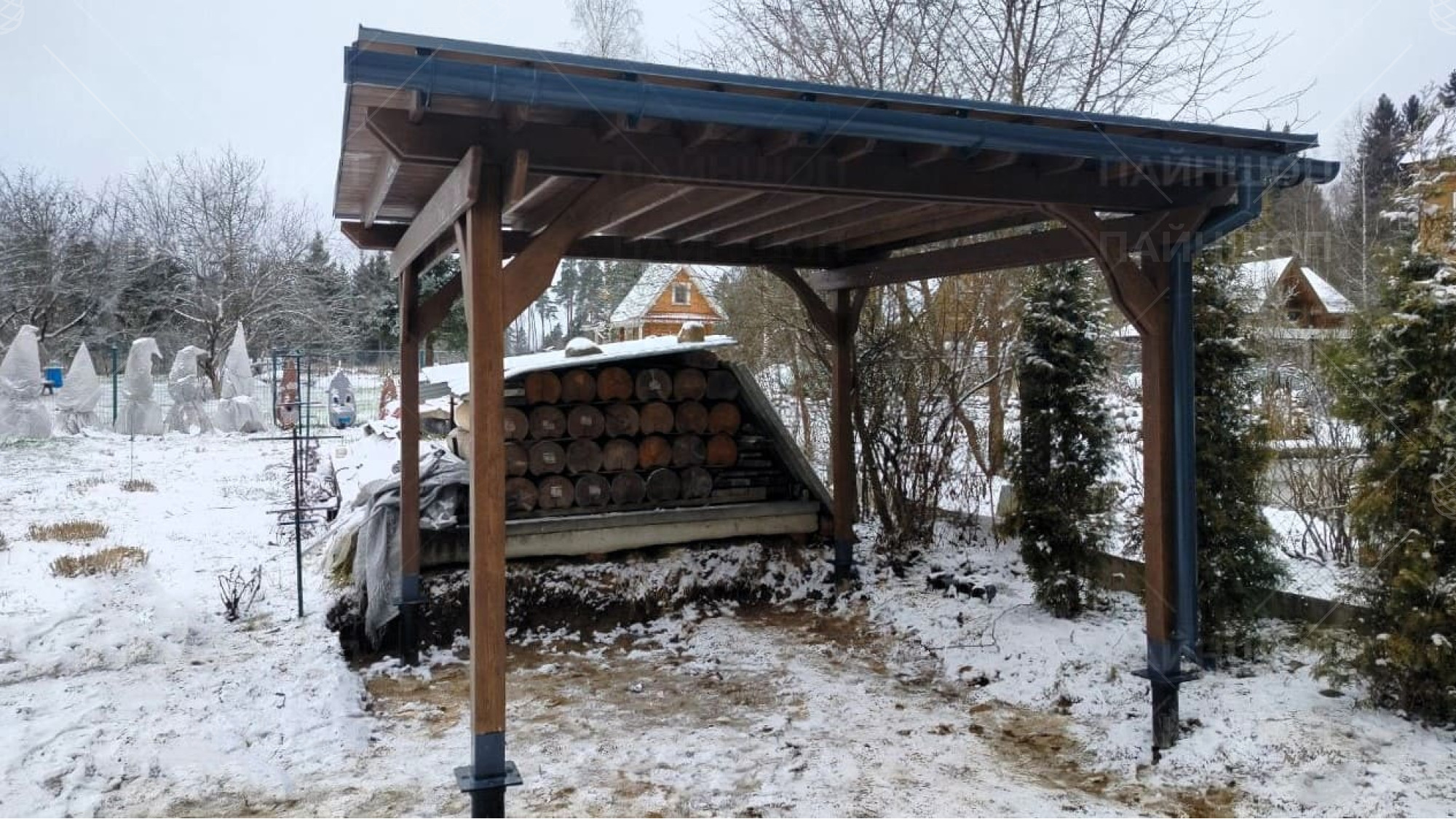 Готовый комплект беседки приезжает на участок в разобранном виде, аккуратно заносится и устанавливется монтажниками