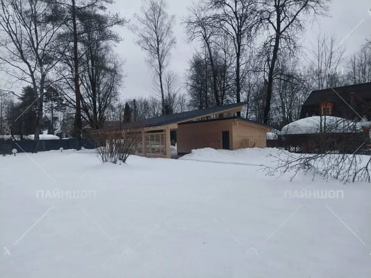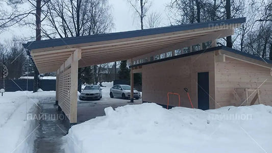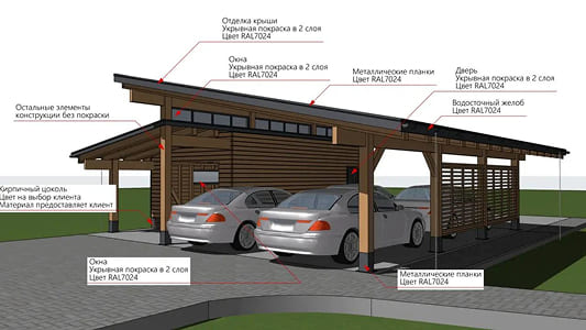 Гаражный бокс выполнен по каркасной технологии, обшит с внешней стороны имитацией бруса. Навес верхней частью опирается на стену гаражного бокса, а с противоположной стороны на клееные стойки. Два проема между клееными столбами закрыты решетками, которые выполняют и декоративную роль скрывая вид на парковочные места со стороны участка, так и усиливающую роль соединяя столбы между собой в единую стену.