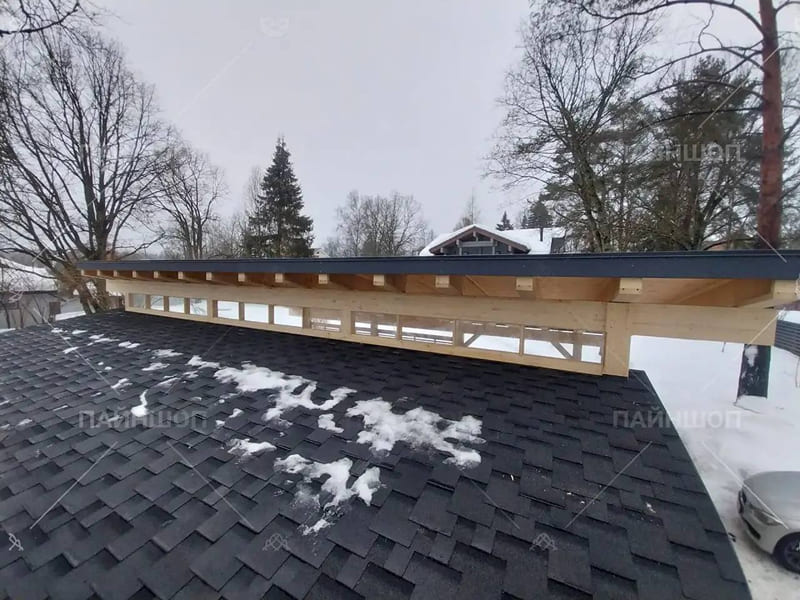 Балки крыши выполнены из двутавровых двойных деревянных балок. Сечение балок рассчитано на ширину пролета. В данном случае двутавры имеют небольшую высоту ребра, и крыша получается не массивный. За счет этого плоскость крыши как бы парит над навесом, и не выглядит очень тяжелой.