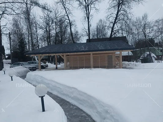 - Участок был предоставлен просторный и без особых проблем в виде других конструкций, затруднения в подъезде транспорта и растительности. Это также придало внешнему виду навеса легкости, он смотрится уместно и эффектно.