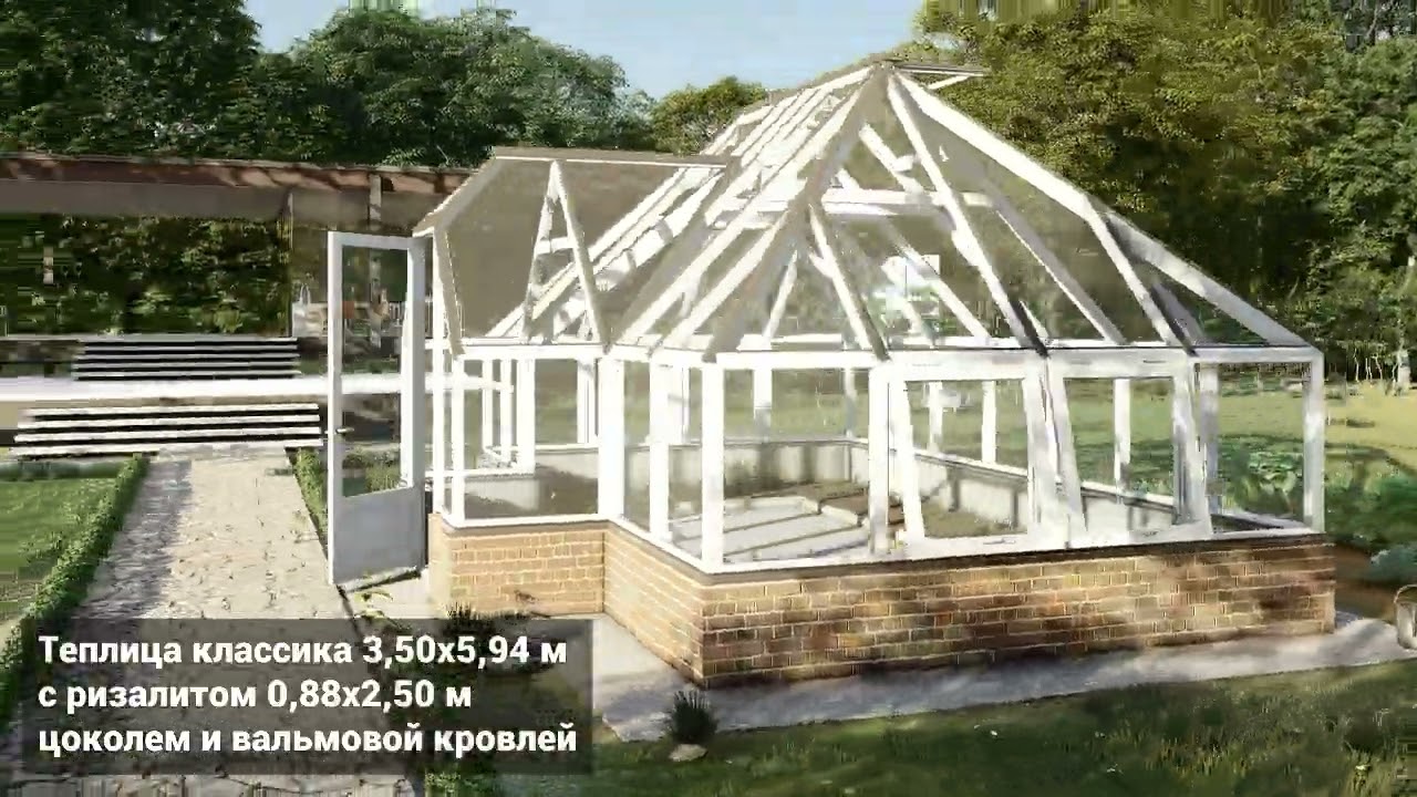 Теплица КЛАССИКА (лиственница) 3,50х5,94 м с ризалитом, цокoлем и вальмовой кровлей